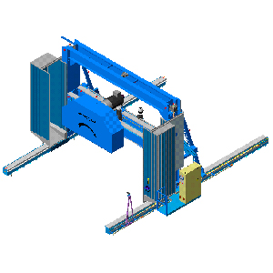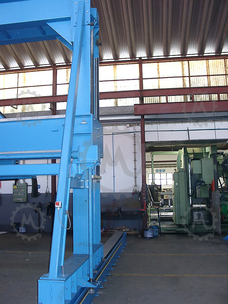 The Gantry structure allow an perfect union of all components, since the lateral twin pillars connected over creating an perfect ring, that supports the vertical travel shafts connected into the wheels support car, that ones are moved by gearbox to allow the slow displacement on cutting process and also improves the fast velocity to make the repositioning.