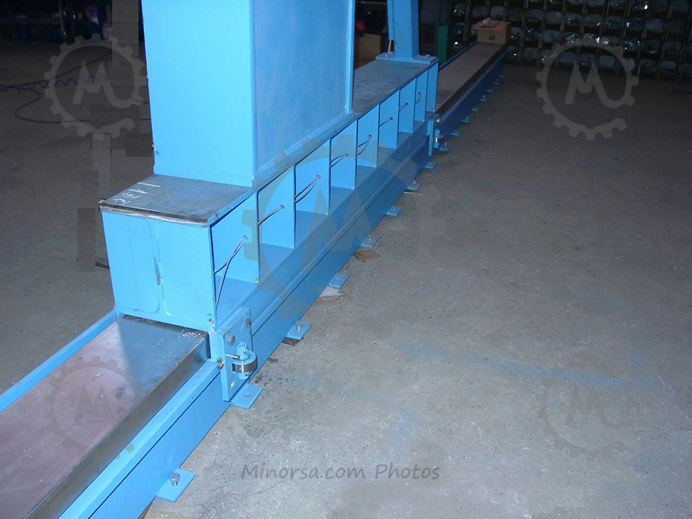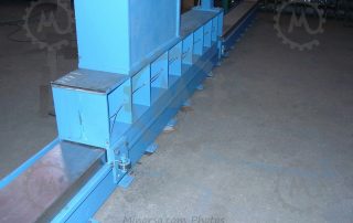 Often used to transfer block from outside into the machine, it is also a solution to be used on the second bench with the exchange of workspace on another table to provide multi-head work used with metering system on stationary saw machines. The surface has 98,1/2 in / 2,5 mt by 59in / 1,5m and can assemble side arms to provide 78,1/ 2 in / 2 mt, the working height start on 19,1/2in / 50cm with the train rail on concrete to elevate from water on floor.