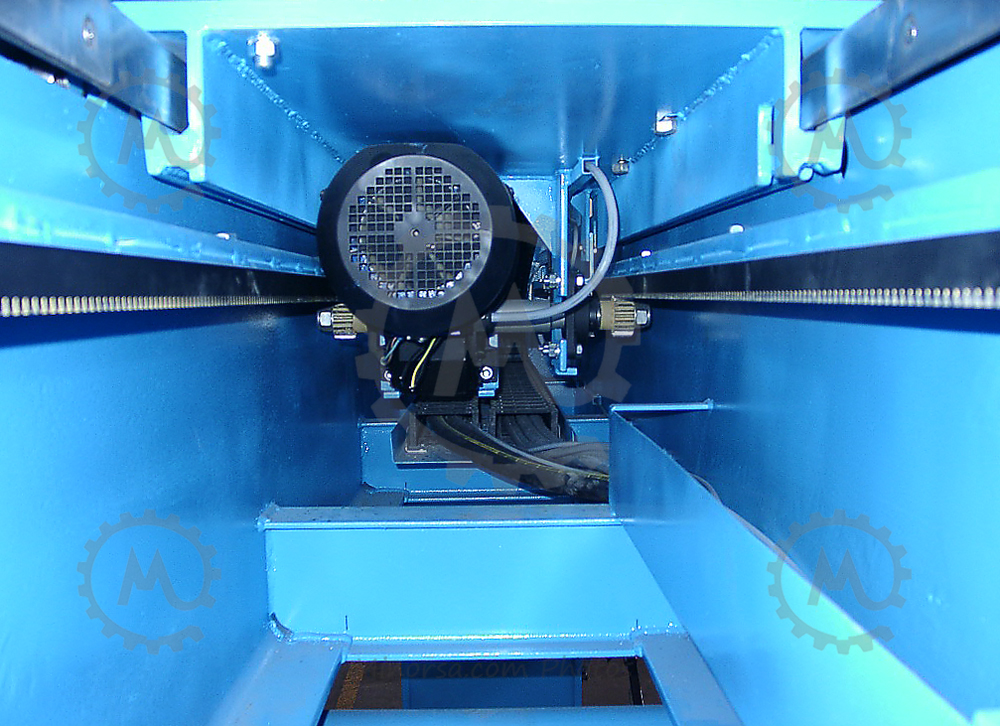 Both pictures show the both sides. The interior has separate boxes to avoid the mud, for oil bath work, the side box has different dimensions on each side, on the mud side there is a system for removing resonance and on the other side the linear bearing guide for providing constant parallelism.
