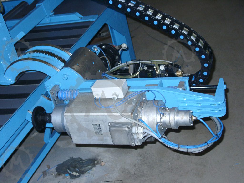 Special electric cables with mesh sheathed, moved through the cable supporting rails. Measure Encoder component with braided wire mesh cables (counting system) to protect against power surges. The base installation also has inner lined water cables consisting of a mesh reinforced rubber hose inside. Shields and rails for collecting the oil coming from lubrication of material used for cutting. Water pressure switch to control cooling and washing of the saw. (Placed on top of pillar for greater accuracy).