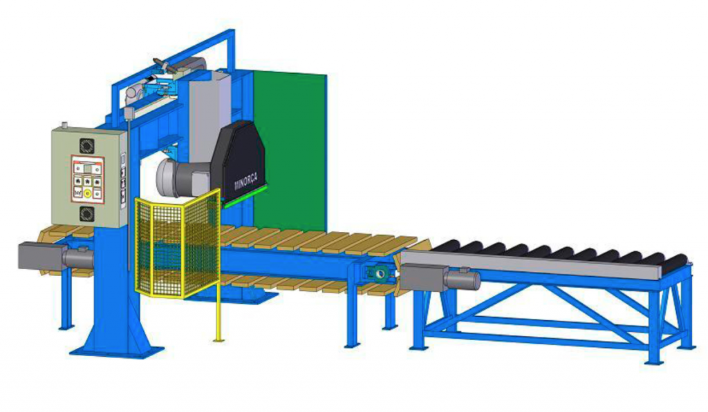 This workbench allows the equipment to work non-stop between major jobs, gaining moments of material change. It can be supported by a loading / unloading robot, can use a system to lift the material in the cutting process, and even has several pneumatic pistons to align the material with the saw. Usually it comes with engine rolls. The width starts on 31,1/2 in / 80cm and the standard length is 118 in / 3m plus on main body plus the exit rollers until pallets, those bodies can be made until 236in / 6m and assemble it together.