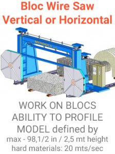 The vertical displacement above 39,1/2 in / 1 m allows several cutting steps and great versatility at the height of the stone. Allow the saw to work on sandstone in two steps. There are several types and lengths of displacement heads to receive the multiple rams. It has a digital programmer that allow you to view various menus, from the introduction of cutting dimensions to the appropriate drawing of the profile. It provides an industrial console for introduce the various cutting dimensions and allows controlling the cutting speed by checking the saw tension. Also allows the return of the cut at maximum speed. There are several types of blench for the best working condition.