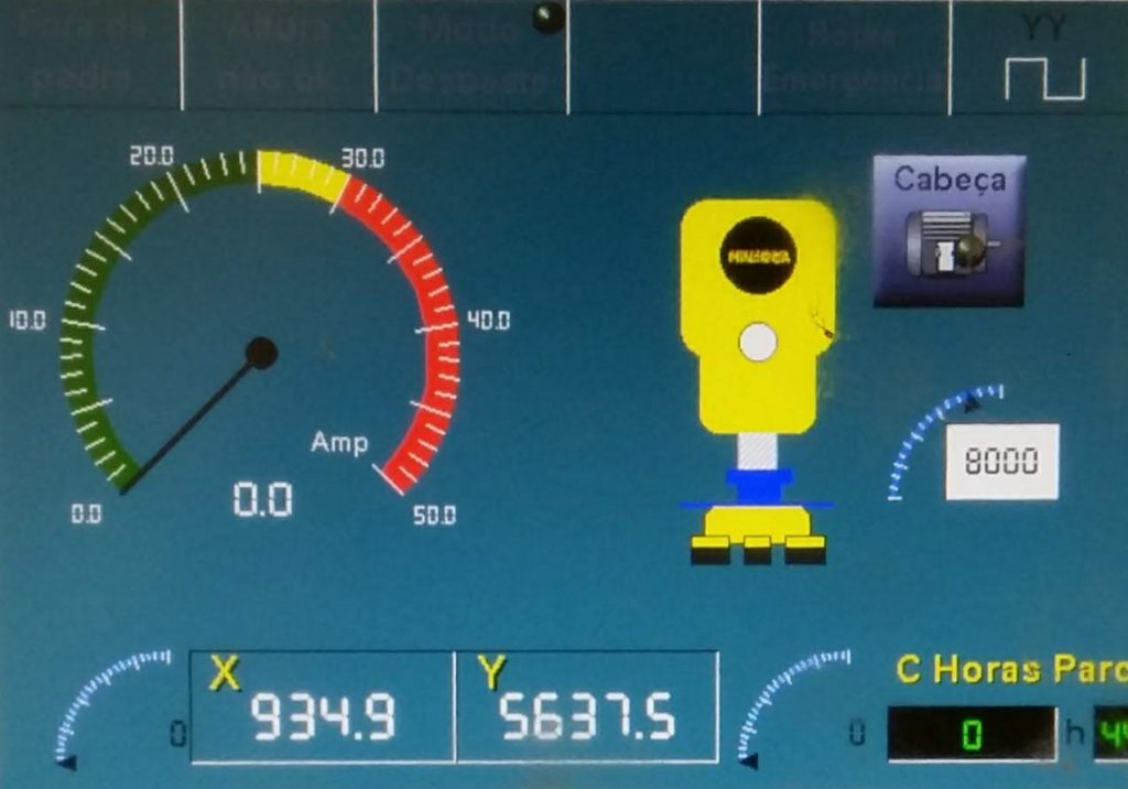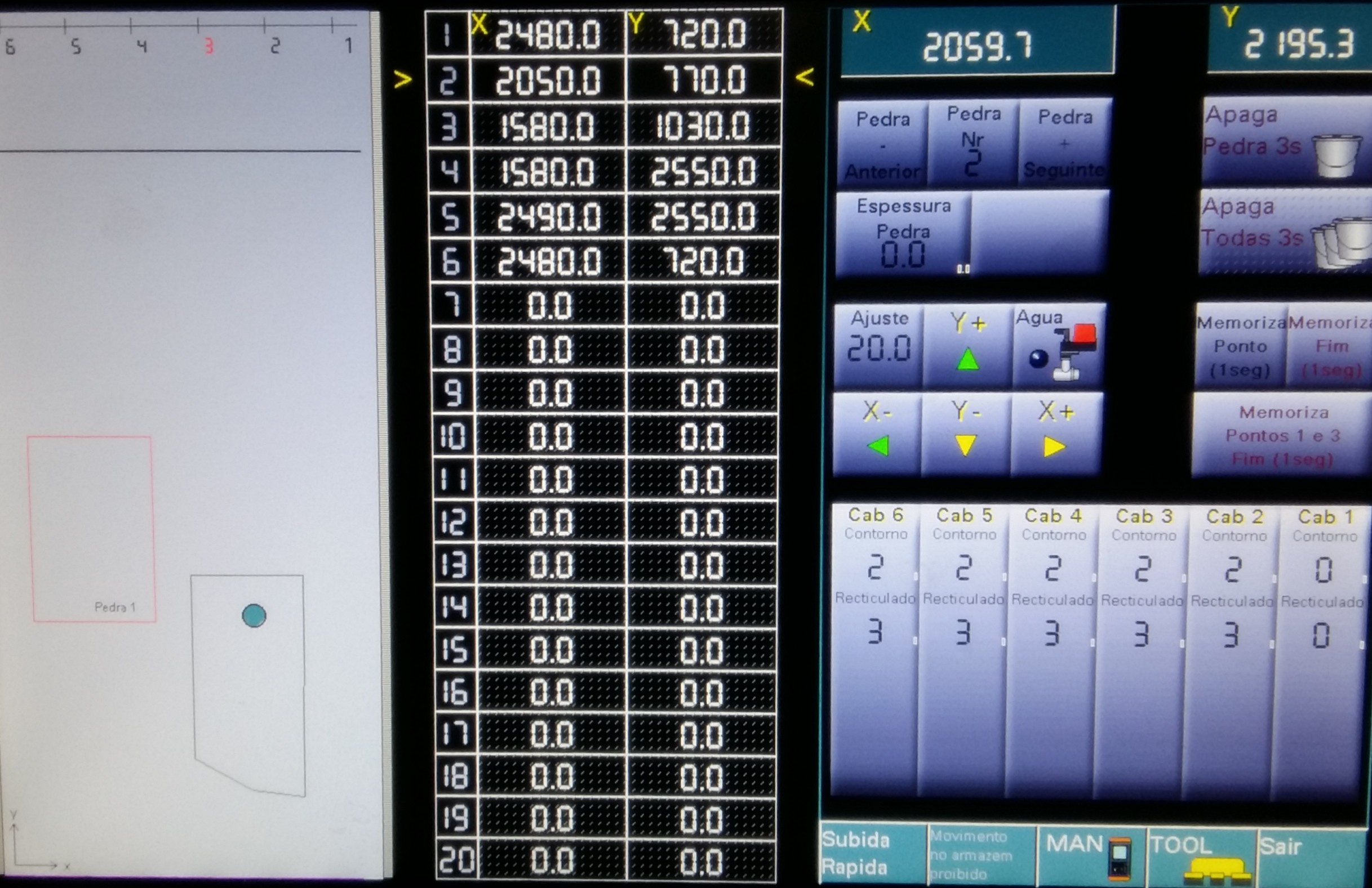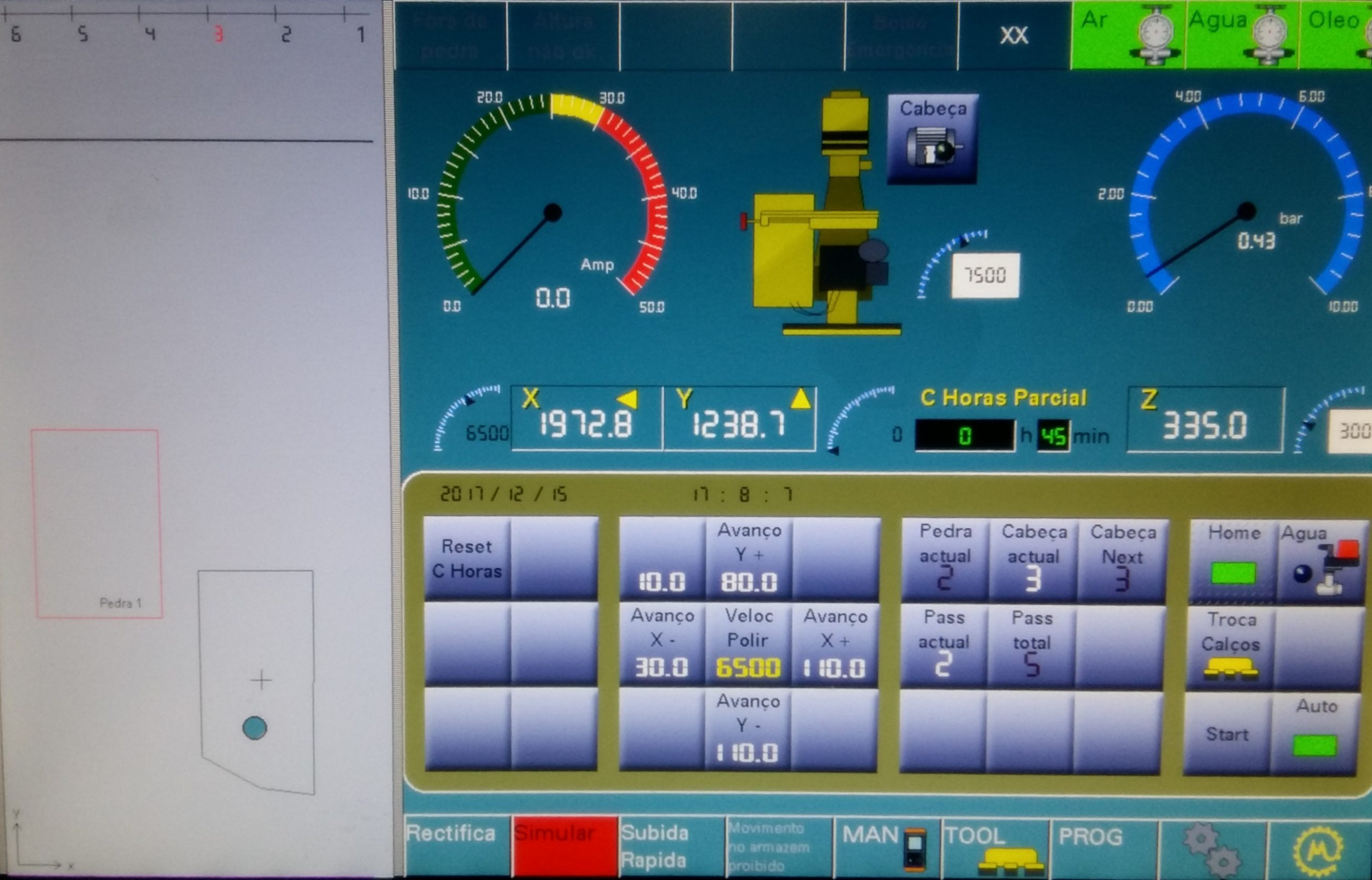 The menus show the head position as well the stones, that ones can be inserted in diverses shapes, also hardness or thickness, let introduce multiple pieces on the same space and program the order, the number of passages of each head or abrasive, in every instant can check basic parameters, change menus, pause the working cicles.